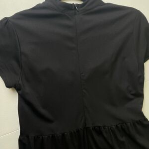 Features: Sheer mesh yoke with ruffle trim; decorative spider buttons at front; ruffled hem; mock neck; back zip closure; stretchy knit