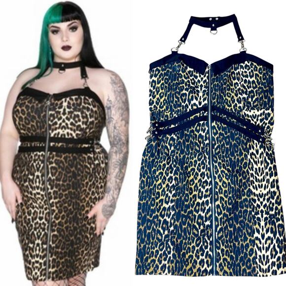 Rock this Killstar Man Eater Leopard Dress! It's a size 4XL and features a neck choker with a zip front and strappy bondage accents. The fabric is stretchy, making it very comfy. Though the skull zipper pull is missing, the hoop is still attached, making it easy to zip. Get creative and add your own fun charm! Otherwise, this dress is in great condition.