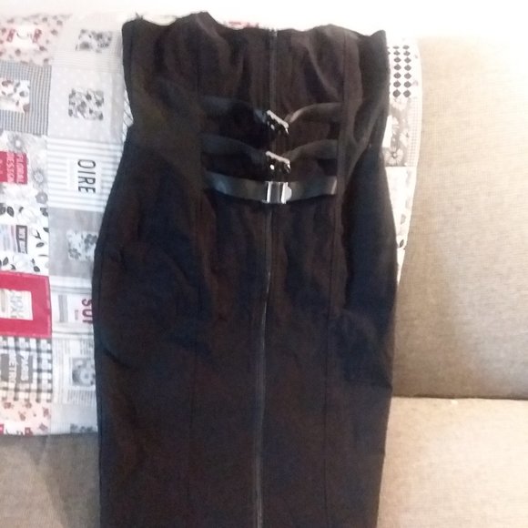 Medium zip front bodycon dress in a sturdy, stretchy fabric, with buckles at the front and sheer inserts on the sides. Halter neck with three snaps. Low cut, falls to the knee. LOVE this dress, way too small now. Measurements upon request <3 Any additional photos needed, just ask. Nonsmoking household with two dogs that are not allowed where dress is stored.