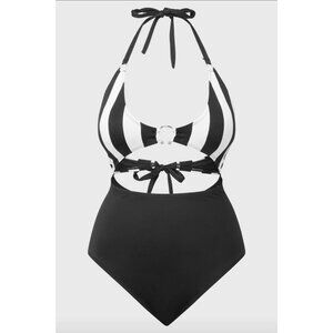 This striking one-piece features a bold black-&-white stripe design, statement cutout, & metal hardware for a rebellious edge.
