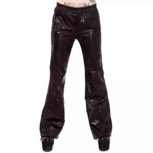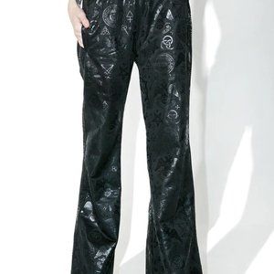 Of course ya gotta be physically fit to carry around so much dark energy! These amazing track pants feature a sleek black construction printed with our signature style occult print graphics all over, repeated black-on-black, finished with side pockets. Elasticized waistband, trim down the sides reading "Fuck What They Think" and flared boot cut style. Sporty gone Goth and we love it!