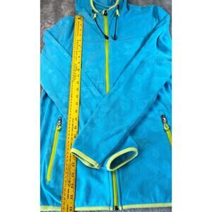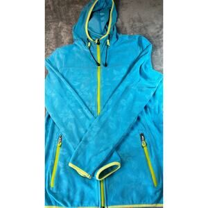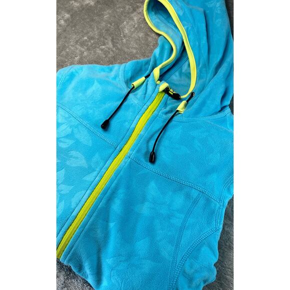 Keywords: hoodie, jacket, full zip, teal, neon yellow, floral pattern, fleece, athletic, casual, outdoor, comfort, activewear, zippered pockets