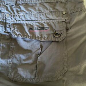 Killtec Technical Outdoor Bermuda short, size 42/12, gray. Comfortable, functional, protective,apparel technology, 2 front pockets with additional front zip and button pockets, 1 pockets on bum, other is for aesthetics, missing adjustable waist toggles/elastic & small mark on front bottom short hem( see pics) priced accordingly. Otherwise good condition, lots of hiking, biking, walking, camping life left in them. Waist measurement laid flat 16.5”