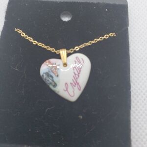 Gold colored necklace with a white kiln-fired heart pendant that says 'Crystal' on it with a zebra and giraffe in the top corner.