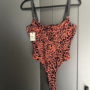 Cheetah print, sheer, stretchy elastic in the back, and has an underwire. Retails for around $100. Size XL.