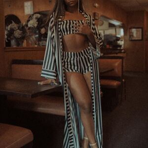 Welcome Spring in this beautiful satin print robe with cabna-stripe inspiration. The bold black & white stripes are punctuated with piping in neon green to add a fresh pop of color. Kilo Brava's inspiration comes from exploring the lives of fearless women ... women outspoken in their accomplishments, style & personalities. Let yours shine in this stunning piece!