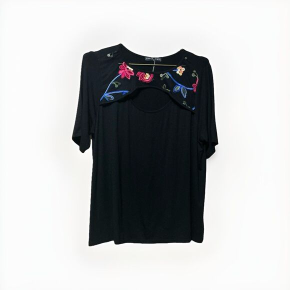 Kim & Cami Blouse Womens 1X Black Floral Embroidered Sheer Peek A Boo Neckline