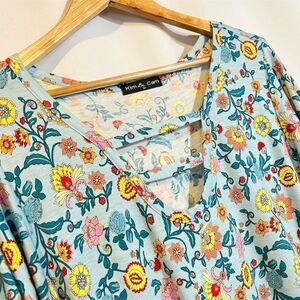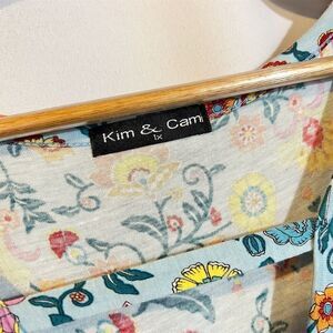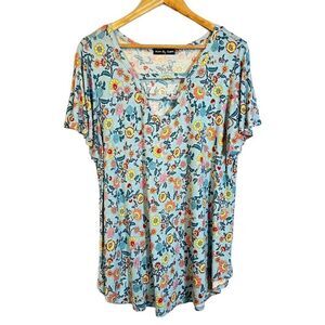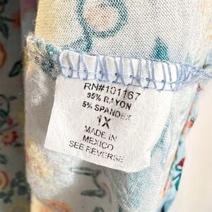 Keywords: Kim & Cami, plus size t-shirt, women's floral top, multicolor t-shirt, V-neck t-shirt, short sleeve top, casual wear, weekend outfit, everyday fashion, rayon spandex blend, women's plus size clothing, floral pattern shirt, comfortable fit, pre-owned women's top, Mexico made clothing