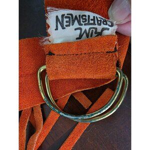 Add a touch of bohemian flair to your wardrobe with this orange suede belt. Featuring a brass D-ring buckle and fringe detailing, it's an ideal accessory to complement various outfits. Crafted by Kim Craftsmen, this belt adds a unique style element to casual and formal ensembles alike.