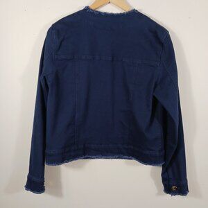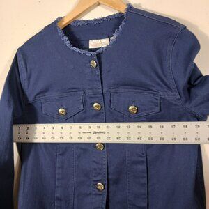 Kim Gravel, Belle, Medium Navy Denim Jacket with Gold Buttons and Frayed Trim. This jacket isi n very good pre-owned condition and features: