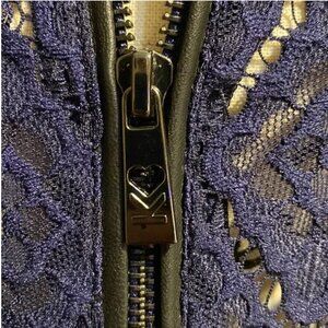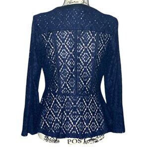 Kim Gravel Navy Peplum Lace Jacket XXS Lace Sleeve Zip Front Romantic Dark Chic