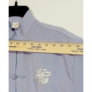 Nice pre owned Kim Lai Fashions XL 100% Silk Chinese Tang shirt, light blue, embroidered dragon with frog button closure