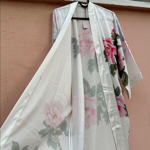 Elegant white kimono robe with pink floral design. Perfect for lounging or as a stylish cover-up.