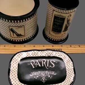 Kim Poloson 3 Piece Paris Themed Bath Set. There is a soap dish, a tumbler and a jar. I believe the jar once had a lid, but it would still be useful in the bath. The soap dish is approximately 6 inches. The tumbler is approximately 3 by 4 7/8 inches, and the jar is approximately 4 1/2 by 4 inches. They are all in good shape. Any white spots you see on the black are camera glare. Please view all photos for condition and details. This is a really nice-looking bath set.