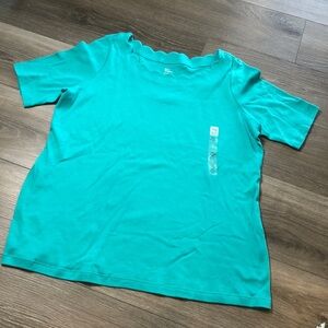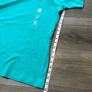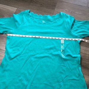 The Kim Rodgers Perfectly Soft 100% Cotton Women's XL Scalloped Short Sleeve Shirts are a stylish and comfortable addition to any wardrobe. Featuring a round neckline, pullover closure, and easy-care fabric, these shirts are perfect for casual occasions and travel. The scallop accent adds a touch of detail to the classic blue color, making them versatile for all seasons. Made with quality in mind, these shirts are machine washable and designed for a regular fit, ensuring both style and comfort for the modern woman. Please note that clothing colors may appear different on screen. Comes from a smoke free home and pet friendly home. Measurements taken flat with garment un-stretched. Please ask any questions that you may have.