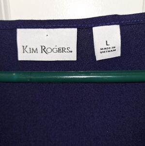 This is a NWT Kim Rogers 3/4 sleeve navy whimsy flyaway top in a size large. Office, party, loose-fitting, conservative, lagenlook, trendy, stylish top. 19" PTP, 28" length.