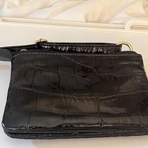 Shiny black alligator embossed cross body bag. 22” strap with a few inches to expand.