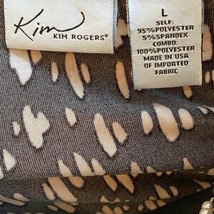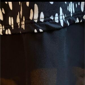 Chic Kim Rogers top with a unique black and white pattern. It has a round neck and sheer black material around bottom at hemline. Ideal for versatile styling. Size large.