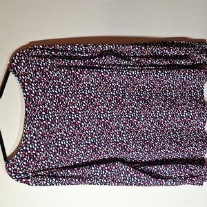Chic top with a blue and pink pattern. Perfect for casual wear. This runs big. Approximate PTP 26" unstretched and the length is 27.5".