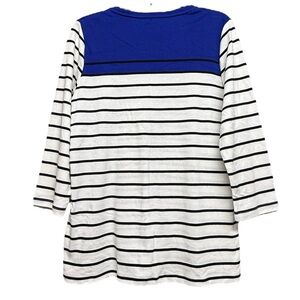 Stylish top with blue yoke. Blue and white stripes. Three-quarter sleeves.