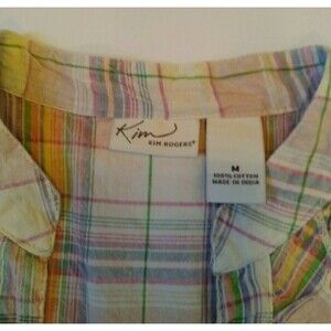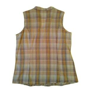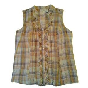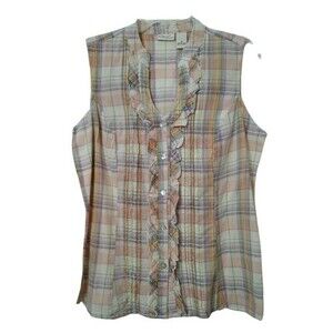 Kim Rogers Button Up Shirt Womens Medium Front Ruffle Sleeveless Plaid