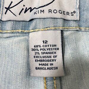 Enjoy stylish comfort in the Kim Rogers Capris Jeans for women. The light blue, size 12, stretch denim pants feature exquisite embroidery and are made of a CottonBlendPolyesterSpandex blend.