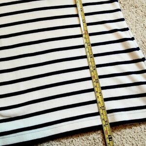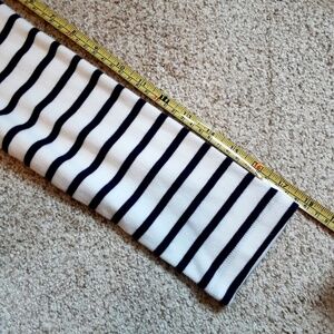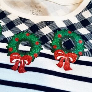 Cute and casual Christmas top, blue and white stripes with glittery green wreaths across the top.