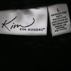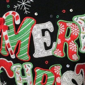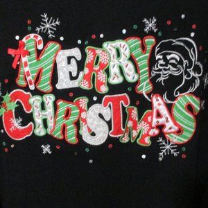 Kim Rogers brand - Black long sleeves, soft and stretchy top that says "Merry Christmas" with embroidery and some sequins. Also a Santa head, snowflakes and candy cane. Colors are black, green, red, and white. So festive! Great condition.