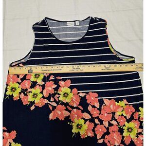 The Kim Rogers Flowers And Stripes Sleeveless Dress is a perfect choice for summer beach days or tropical getaways. This knee-length A-line dress features a vibrant multicolor striped pattern, a comfortable sleeveless design, and a round neckline with a pullover closure for easy wear. The bohemian theme adds a carefree, summery feel to the dress, making it ideal for relaxed summer occasions. Plus sized in 2XL, this dress from the brand Kim Rogers is a stylish and summery addition to any woman's wardrobe. Measurements in photos. Pre-owned in excellent condition