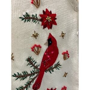 Festive and cozy! This Kim Rogers holiday vest features beautiful embroidered red cardinals, floral accents, and gold beading on a soft cream knit. The faux fur collar is detachable for two different seasonal looks. Perfect for holiday parties or winter outings!