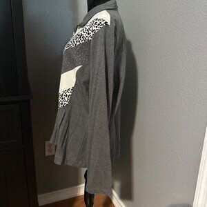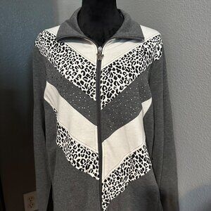 Stylish Kim Rogers Woman full-zip jacket in size 1X. This soft gray heather cotton-blend jacket features bold chevron panels with black-and-white leopard print and sparkling rhinestone accents. The standout detail is the silver-tone leopard head zipper pull, adding a chic finishing touch.