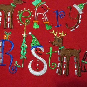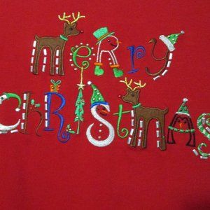 Kim Rogers brand - Red Christmas long sleeve top that is soft and stretchy. Says "Merry Christmas" with super cute embroidered Christmas designs. Rounded neckline. New with tags.