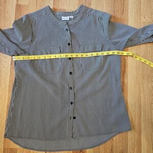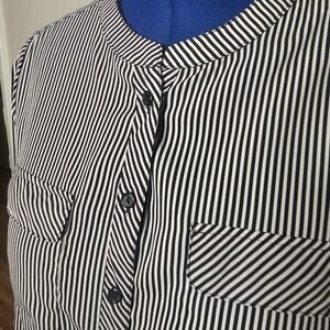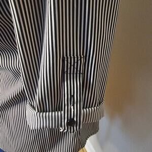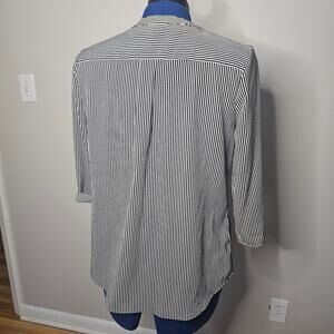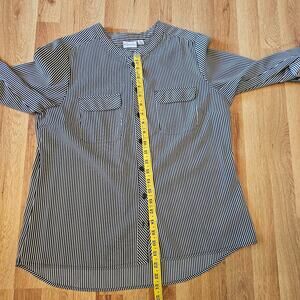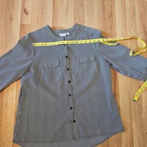 Kim Rogers Navy White Stripe Button down blouse with sleeve roll button closure