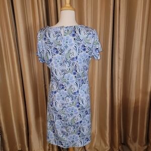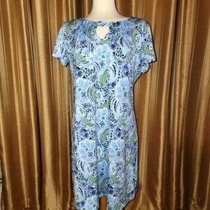 Kim Roger's blue, green, and white paisley dress. Key hole neck line with back button closure. Polyester/ Spandex blend, very soft and cool. Chest measures 19", shoulder to hem measures 36".