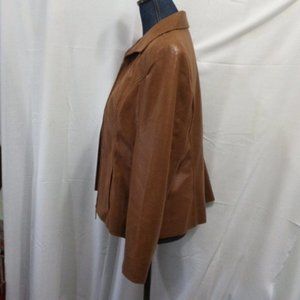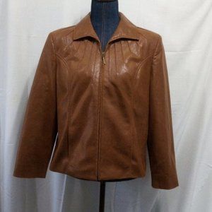 Nice lightweight faux leather jacket by Kim Rogers. Camel color with front stitched accents, zipper front and pockets. Lined with rayon type material. Starburst pintuck and princess cut body.
