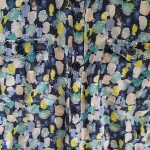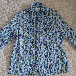 Kim Rogers Petite Large Linen Button Front Shirt Blue Green Abstract Print Roll