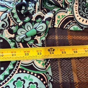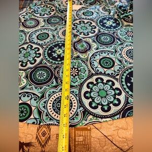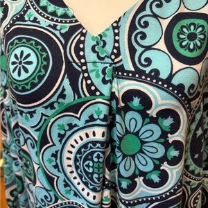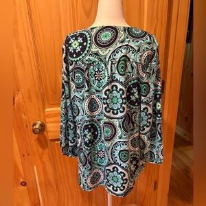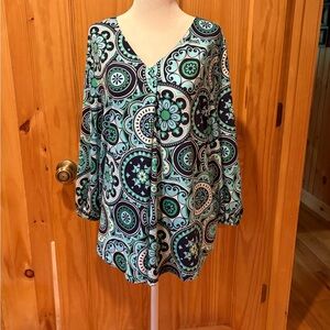 Kim Rogers brand top, featuring a V-neck and 3/4 length sleeves. It has a colorful pattern with shades of blue, green, and dark navy blue. The top is made of a soft and breathable material, likely a cotton blend. It is designed with a comfortable and flattering fit, often described as a tunic style. Women’s Large. NWT