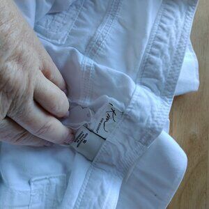 White shorts by Kim Rogers in Size 16. Shorts have silver buttons with 2 front and 2 back pockets, fly front and belt loops. Shorts are in good condition but do have a small spot on the back which can probably be treated.