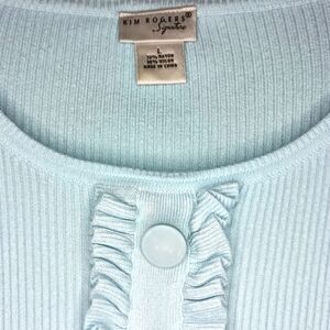 Beautiful Sky Blue Kim Rogers Signature Lightweight Sweater with Button and Ruffle Detail. Excellent Like New Condition with no Pilling or Flaws. Looks like it's never been worn.