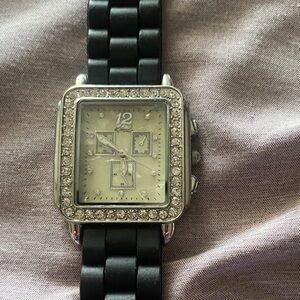 Elegant watch with a silver face and crystal accents. Features a black rubber/silicone