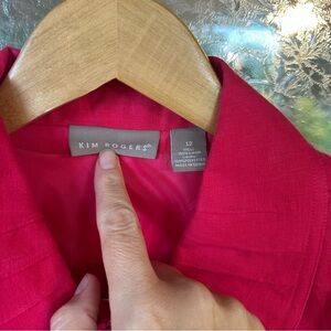 The Kim Rogers Size 12 Cropped Peplum Button Up Jacket is a stylish and versatile outerwear piece perfect for casual and business occasions. Made from lightweight linen with a polyester lining, this short jacket features 3/4 sleeves and a solid pink color. The button closure adds a classic touch to this basic jacket, making it a must-have for the winter, fall, and spring seasons. With its regular fit and easy care instructions, this jacket from Kim Rogers is a practical and fashionable choice for any woman's wardrobe.