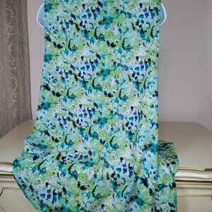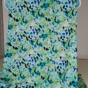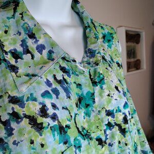 A lighweight sleeveless size 2X top by Kim Rogers. The top has a collared neckline and two front chest pockets and is in the colors of blue, green and black in an abstract design. The top can be worn as is in the hot summer months but also in those cooler months when paired with your favorite blazer or cardigan.