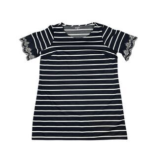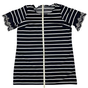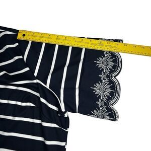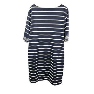 The Kim Rogers Striped Midi Slip Dress in size 2X is a stylish and comfortable option for plus-sized women. Made from a blend of polyester and spandex, this dress features a flattering scoop neckline and short sleeves, making it perfect for casual occasions or travel. The blue color with white stripes adds a touch of stripe pattern to the garment, while the midi length provides a versatile option for the warmer seasons of spring and summer. Easy to care for with its machine washable fabric, this slip dress from Kim Rogers is a must-have for any fashion-forward woman.