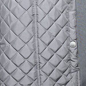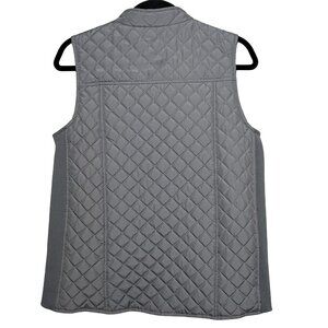 This Kim Rogers Vest is a women's sleeveless quilted jacket in solid gray. Size small, it's a perfect outerwear layering piece made from durable polyester.