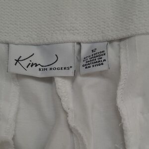 Previously owned and gently worn. Stylish white capris by Kim Rogers. Perfect for casual summer wear. Front pockets. Back pockets sewn shut. Stretch waist band. Cotton/spandex blend. 10" Rise 19" Inseam