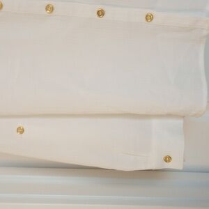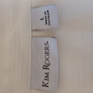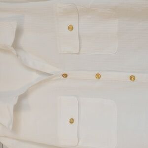 This is a Kim Rogers white button down blouse in a size Large. It has beautiful gold buttons and two front pockets. It has side slits and a V Neck. It has long sleeves. It has a few loose threads on the hemline, shown in pictures.