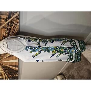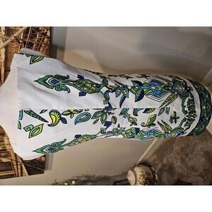 Kim Rogers shift dress, perfect for any occasion. This eye-catching dress features a vibrant floral pattern in blue and green against a crisp white backdrop, offering a fresh and stylish look. Crafted from a soft blend of 97% polyester and 3% spandex, it ensures comfort while maintaining a flattering silhouette.