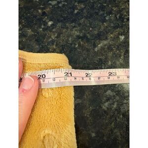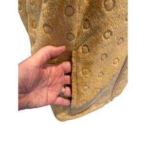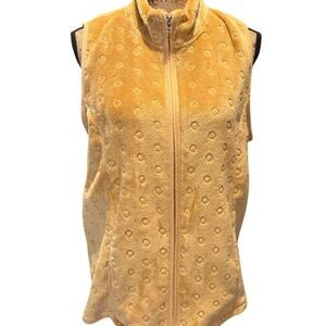 The Kim Rogers vest is a women's large, sleeveless jacket made from polyester with a soft velour-like feel. It features a full zip front and a vibrant Gold polka dot pattern, suitable for casual occasions in fall and spring. The vest is machine washable for easy care. It is pre-owned with normal wear. Keywords: Kim Rogers, women's vest, large size, Gold vest, polka dot, sleeveless jacket, casual wear, fall fashion, spring fashion, machine washable, zip closure, pre-owned.