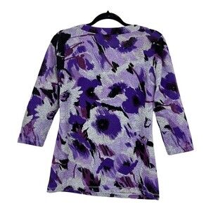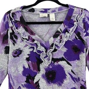Kim Rogers Womens Size Medium Purple Floral Ruffle V-Neck Knit Top