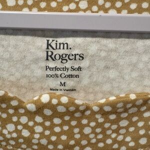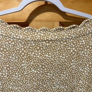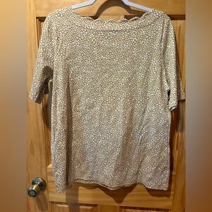 Kim Rogers brand women's top in a tan color with a white polka dot pattern. The top has a scalloped neckline and 3/4 sleeves.
